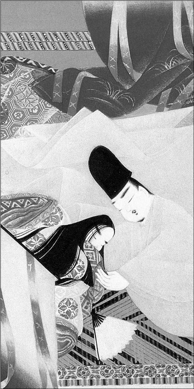 如图中男子宠爱心爱的女子般,桐壶帝过分宠爱这位桐壶更衣,常与她日夜相伴,而冷落了其他嫔妃,自然使一些人十分妒恨。平安时代的政治与后宫表里一体,每位嫔妃的背后都有强势的外戚支持,即使天皇也不能随心所欲地专爱一位更衣,这样只会让对方遭受憎恨与忌妒,痛苦万分。