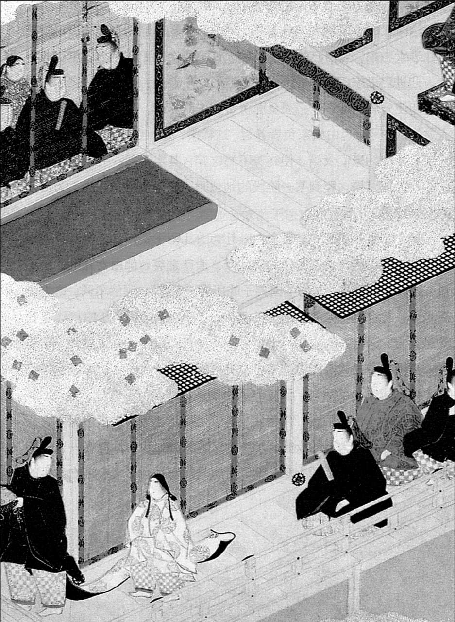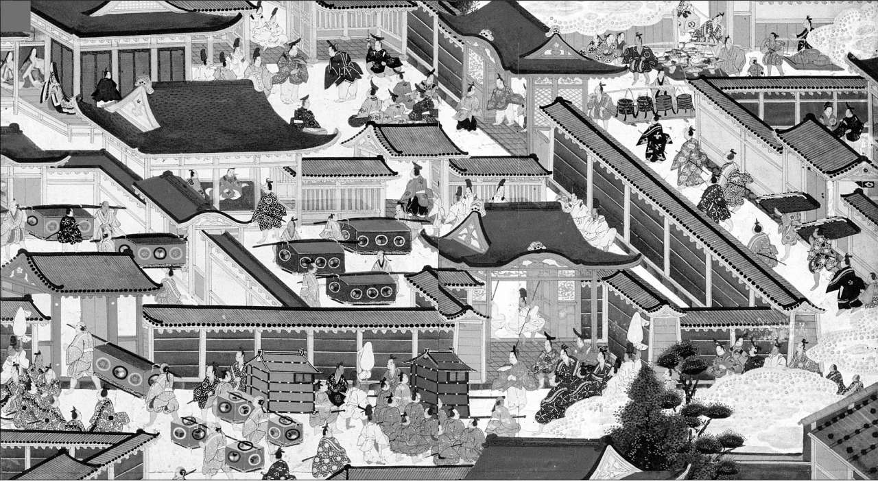 女官受天皇派遣,来到桐壶更衣家中,向更衣的母亲表示问候。丧女之痛让更衣的母亲无心打理庭院,与京都的富丽繁华相比,显得十分冷落悲凉。图为平安时代京都的繁华景象。