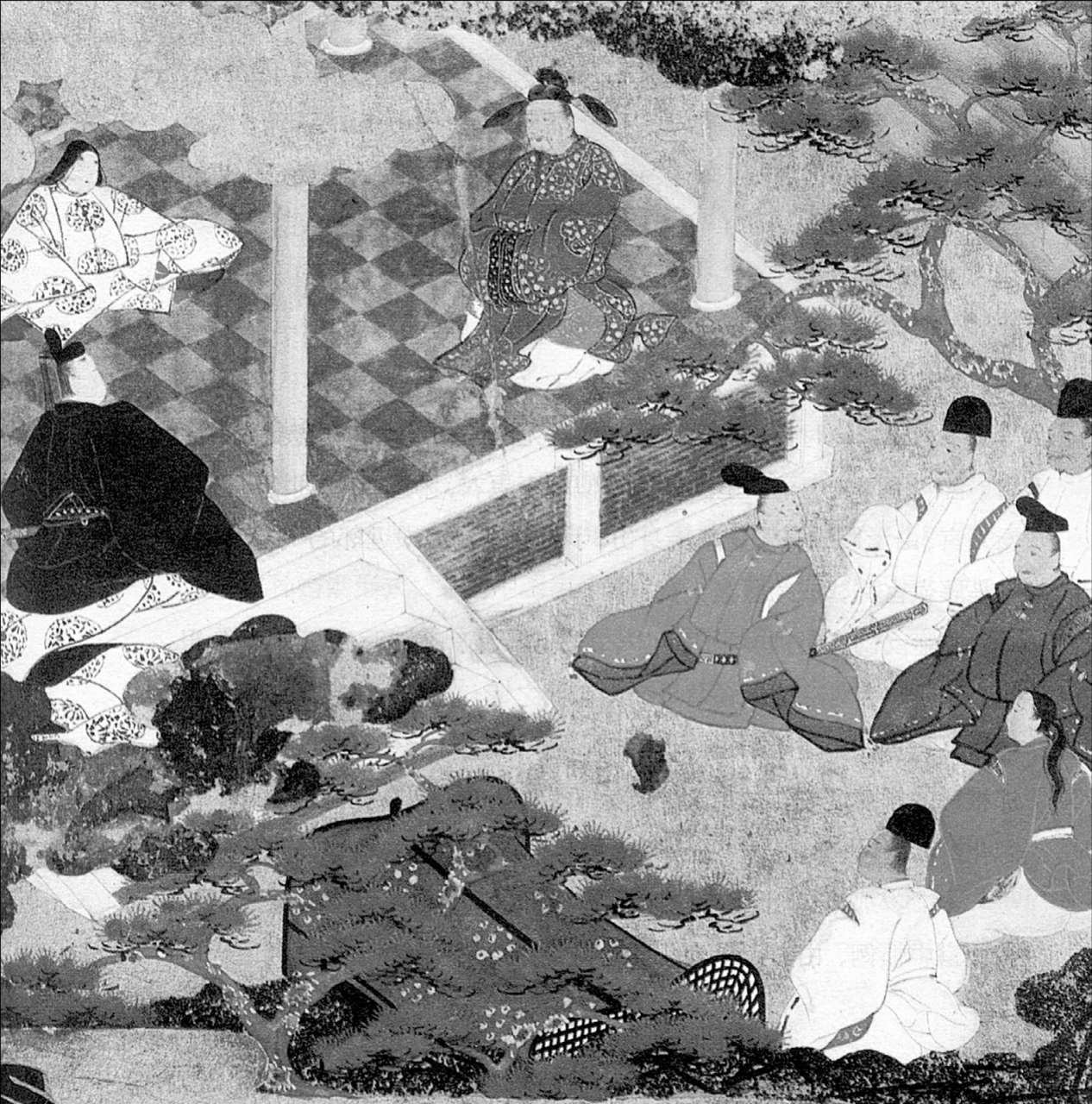 源氏伪装成右大弁的儿子,来到鸿胪馆让朝鲜相士看相。相士大为吃惊,认为他既有帝王之相,也有重臣之相。这份预言暗示了源氏的未来,即他将介于帝王与臣下之间的地位,具备半帝半臣的身份。图为鸿胪馆内相士为源氏相面,阶下众人议论纷纷,仿佛吃惊于相士对源氏未来的矛盾预测。
