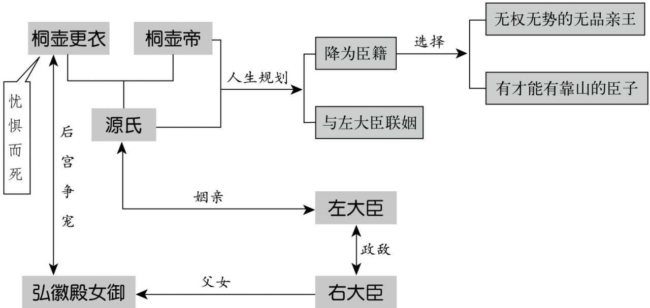 虽然源氏深受桐壶帝宠爱,但是母亲地位低微,又没有外戚支持,使得他前途堪忧。桐壶帝将他降为臣籍,教以辅助朝政之能,并与左大臣联姻,就是安排他成为有才能、有靠山的臣子,而不是空有亲王头衔而无所凭依的无品亲王。