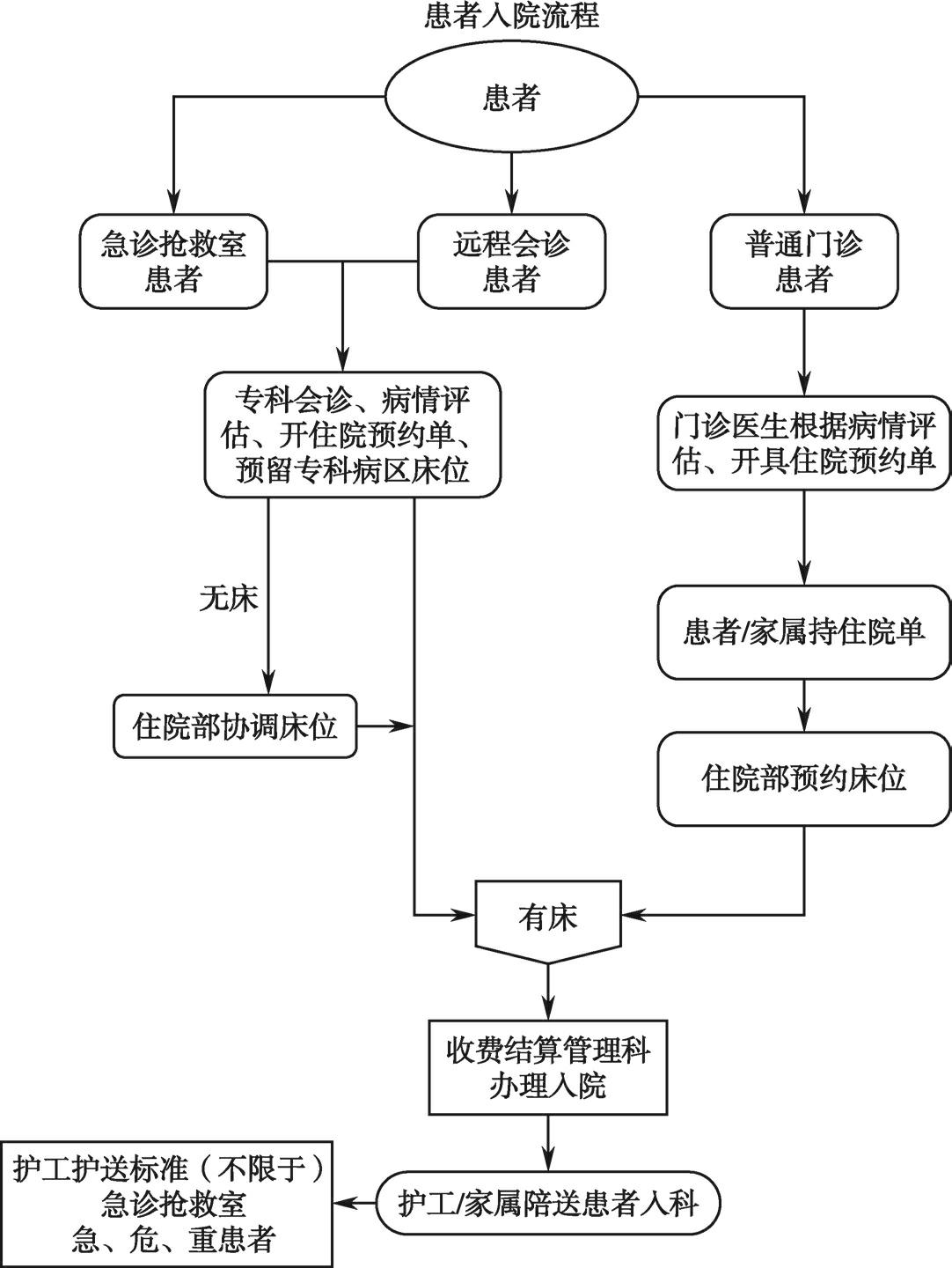 为了保证急诊、慢诊患者的有效转入,医务部住院部制定了患者入院流程,对急、危、重住院患者安排采取优先收住,对慢诊住院患者实施床位预约(图2-7)。