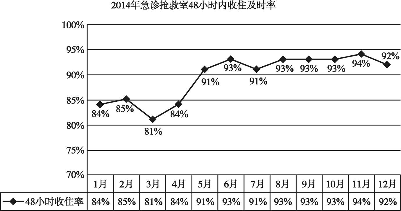卫生计生委要求医疗机构急诊抢救室的患者滞留时间不超过72小时。根据医院急诊抢救室急、危重症患者多的现状,医务部将急诊抢救室患者转入收住率指标前移至48小时内,并由住院部设专人管理,协调、督促临床科室尽快安排收住急诊抢救室患者,同时,夜间、节假日行政、临床双总值班对急诊抢救室进行巡查,加大协调力度。2014年急诊抢救室患者48小时内收住率由84%提高至90%以上(图2-8)。