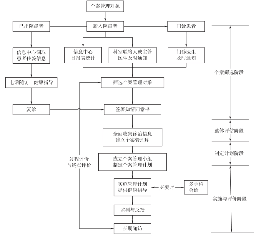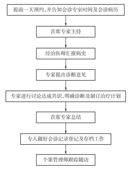 为使疑难和复杂病例得到患者最佳诊断和治疗方案,最大限度地发挥多学科学术和专业优势,医院组织成立了各专业组首席专家组,采取多学科联合会诊的模式进行会诊达成共识形成会诊意见,制订最佳综合治疗方案;后由个案管理师建立完整的个案管理档案,进行患者的跟踪随访和健康指导(图2-10)。