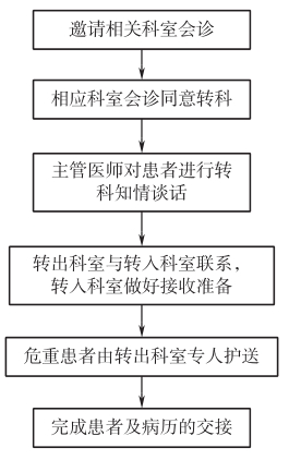 转科时医护人员的沟通主要体现在书面交接和口头交接两种形式。我们的具体做法是,转科前会诊医师与主管医师进行充分沟通后同意转科,转科前主管医师要完成转出记录,开具转科医嘱。危重患者转出病区时,由本病区工作人员陪送到转入科室病区,并向转入科室病区值班医护人员交接,保证治疗的延续性。尤其在手术科室,患者的术后治疗取决于手术操作中的处理和发现。因此,最重要的问题是将所有与患者情况相关的重要操作和结果记录在患者病历中,保证了下一个医疗服务提供者能够获得患者的相关信息,如ICU。此外,在危急值沟通交接也是重要的环节之一,具体参见IPSG.2部分(图2-9)。