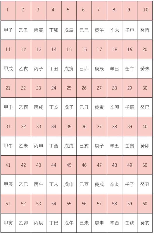 天干有十,第一干是甲;地支十二,第一支为子;甲子配合重复六次又回到甲子,如此即六十甲子。