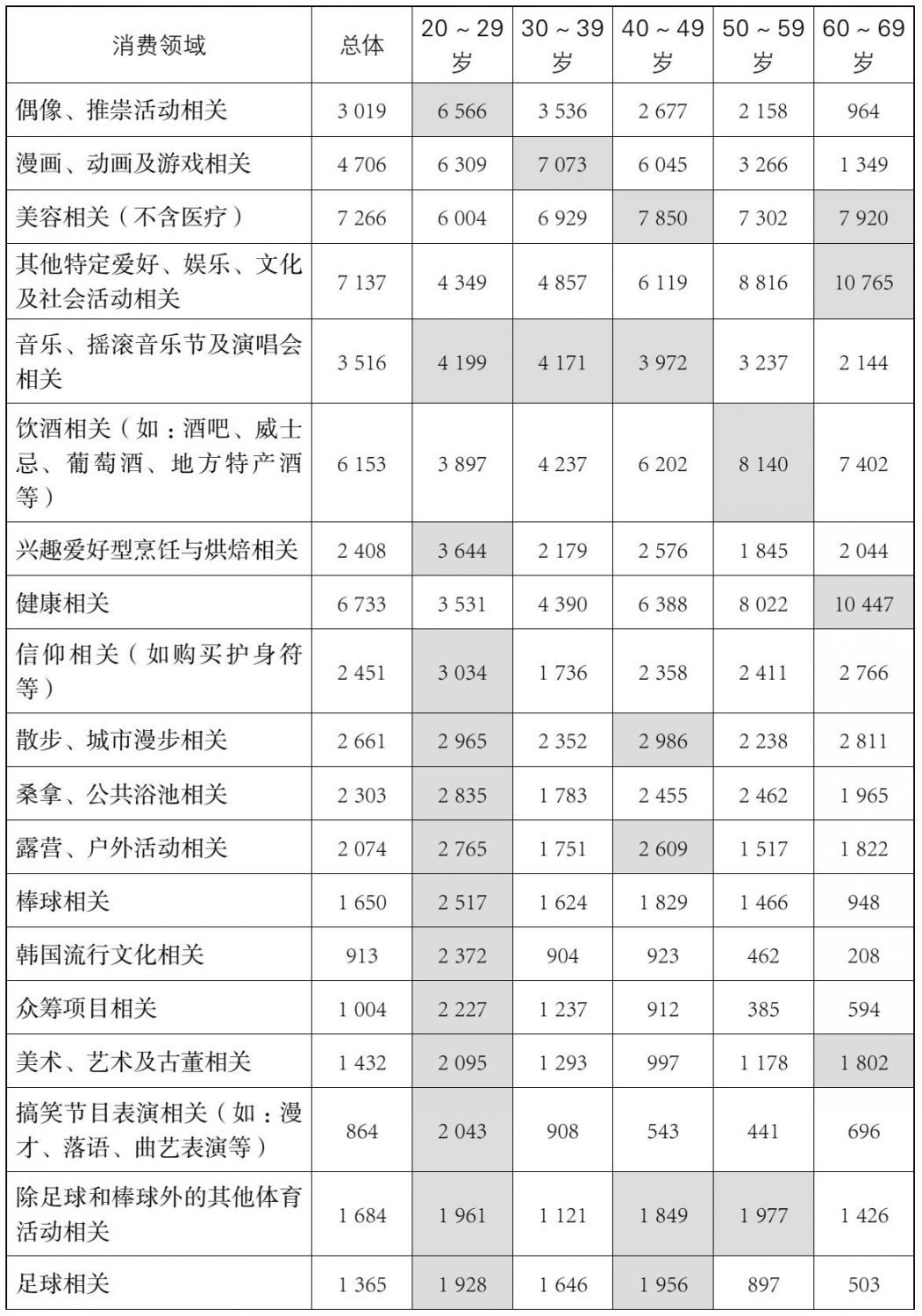 首先,从人均年消费额看,不同年龄段在偶像和推崇活动相关的消费差异尤为显著。在这个领域,20~29岁人群的消费额几乎是紧随其后的30~39岁人群的两倍。