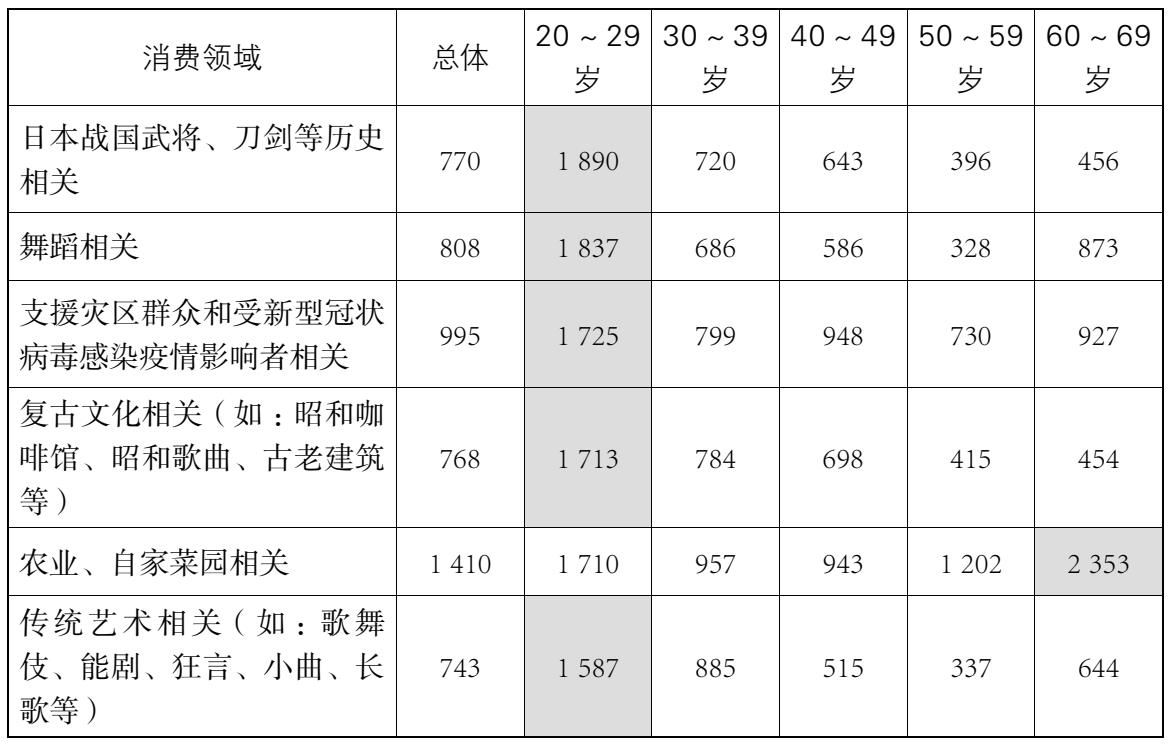 从不同年龄段市场规模的倍数差异来看,20~29岁人群与60~69岁人群在韩国流行文化相关消费上的倍率为9.65倍,差距最为显著;其次是偶像和推崇活动相关消费,倍率为5.76倍;再次是漫画、动画及游戏相关消费,倍率为3.95倍。此外,日本战国武将[26]、刀剑等历史相关,足球相关,复古文化相关(如昭和咖啡馆、昭和歌曲、古老建筑等),以及众筹项目相关消费的倍率均超过了3倍。