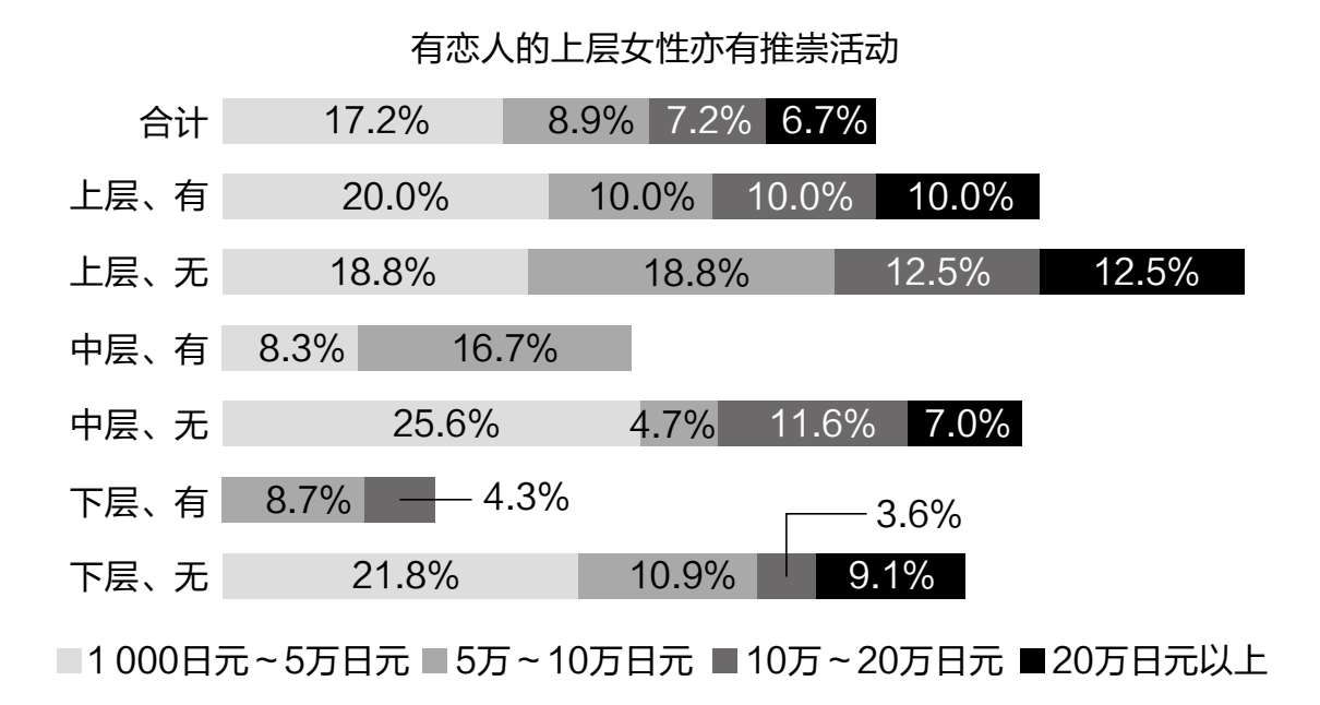 在对日本不同社会阶层及不同恋爱状态的女性进行交叉统计分析时,我们发现一个显著的趋势:从下层到中层,再到上层,单身女性在推崇活动上的消费逐渐增加(如图1-8所示)。特别值得注意的是,中下层单身女性在推崇活动上的消费与有恋人的上层女性接近,这揭示了偶像作为情感替代品的现象在下层女性中尤为突出。而另一方面,也说明即使上层女性拥有恋人,她们同样会参与推崇活动的消费。