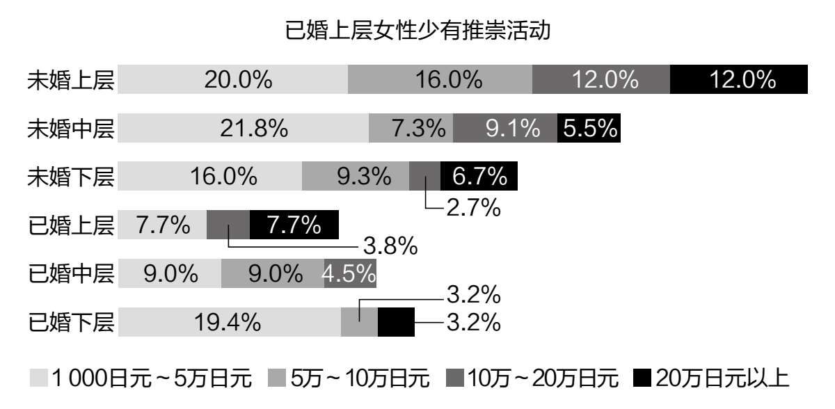 对于30~39岁的女性群体而言,拥有孩子的人中仅有2.9%在推崇活动上的消费超过10万日元,而在没有孩子的女性中,这一比例上升至9.8%。这在一定程度上表明,推崇活动在某种意义上可以视为对孩子的一种替代。